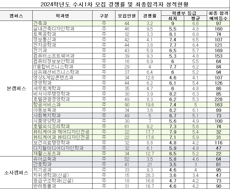 2024학년도 수시1차 모집 학과별 모집인원, 경쟁률, 학생부 등급 최저 및 평균, 최종 합격 예비등수에 해당하는 내용은 아래에 표를 참고해주시기 바랍니다.