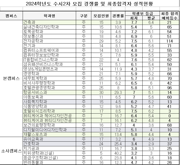 | 건축과(3년), 실내건축디자인학과 (3년), 토목공학과, 정보통신과, 전자공학과, 전기과, 컴퓨터소프트웨어과, 컴퓨터정보보안학과, IT융합비즈니스학과, 섬유패션비즈니스학과, 영상&게임콘텐츠과, 경영학과, 세무회계학과, 비서사무행정학과, 호텔관광경영학과, 항공서비스과, 아동보육과, 사회복지학과, 식품영양학과, 호텔외식조리학과, 뷰티케어과 헤어디자인전공, 뷰티케어과 뷰티디자인전공, 보건의료행정학과(3년), 디지털미디어디자인학과(3년), 재활스포츠과, 유아교육과(3년), 간호학과(4년), 치기공과, 치위생학과, 응급구조학과, 반려동물과 |