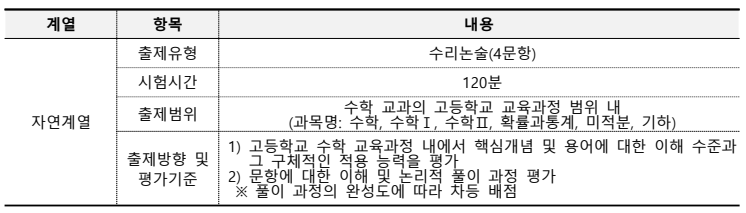 서울시립대의 논술전형의 반영비율은 논술 80%, 학생부 20%입니다. 논술고사의 출제내용은 수리논술로 이루어지며, 출제범위, 출제방향, 평가기준은 아래와 같습니다. 수능최저학력기준은 없습니다. 지난해(2025학년도) 논술 기출문제는 아래 빨강색 링크를 통해 확인해 주십시오.